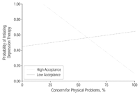 Logistic regression models examining the main effects of physical and emotional comorbidity controlling for covariates identified no significant effects of physical or emotional problem severity on treatment initiation or completion. Logistic regression models testing the interaction of treatment acceptability with physical and emotional problems are shown in Table 1. The results confirmed our hypothesis that physical problems reduced the likelihood of initiating depression care over a 6-month period, but only for patients who reported depression treatment to be acceptable. The model failed to reach significance for completing treatment among those patients who initiated depression care. Educational level predicted completing, but not initiating therapy. It is reassuring to observe no racial disparities in the probabilities of either initiating or completing therapy in these multivariate models. Severity of emotional problems had no effect, independently or in interaction with treatment acceptability, on treatment initiation. Figure 1 demonstrates that as physical problems increase, the probability of initiating depression treatment falls, but only for patients who report that depression treatment is acceptable. A logistic regression model run separately for the patients reporting low acceptability of depression treatment failed to reach significance (P = .27).
