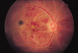 Figure 1. Fundus photograph of the right eye shows diffuse sheathing of all retinal vessels, perivenular hemorrhages, serous macular detachment, and a pigmented chorioretinal scar. Visual acuity was counting fingers with a 3+ relative afferent pupillary defect. Visual acuity was 20/20 OS.