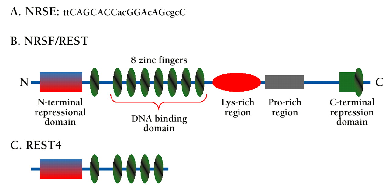 A. Consensus sequence of the NRSE deduced from functional analysis of silencer elements in nineteen genes (57). Nucleotides in lower case vary frequently among functional silencer elements. B. Domains of the NRSF protein (also known as REST).C. REST4 is a C-terminally truncated splice variant of the NRSF protein.