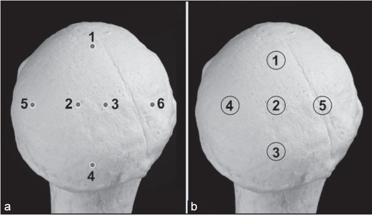 One-hundred (100) bone cylinders were harvested from 20 (10 pairs) humeral head specimens [Figure 2]. Seven (7) cylinders were lost during testing procedures. The first cylinder was harvested from the very center of the head. The other 4 test positions were defined at a distance halfway between the center of the head and the rim of the humeral head. Drilling was started with the 7.0 mm trephine drill burr having circumferential contact with the cartilage of the humeral head. This technique ensured that the cylinders could be harvested orthogonal to the subchondral plate. Following harvesting, the cartilage and subchondral plate was cut 1 mm below the subchondral plate using an Exakt R cutting grinding machine.  | Figure 2: (a) Penetrometer test spots. (b) Location of bone cylinders harvested from the subchondral bone of the humeral head.