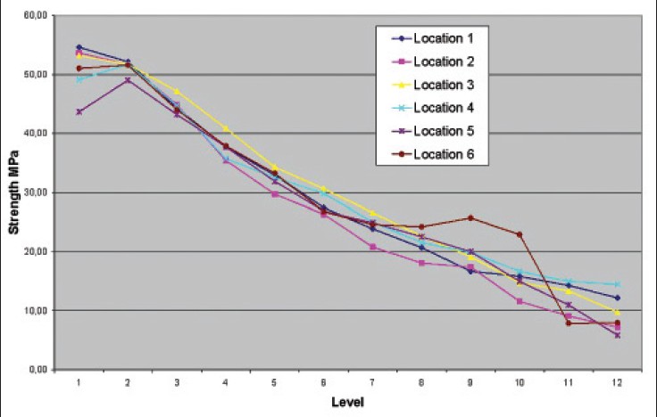 SOLO Power Analysis (BMDP Statistical Software Inc) was used for statistical evaluation. Wilcoxons rank sum test was used to analyze the penetration tests. Unpaired students t-test was used for evaluation of the destructive tests. [14] Correlation analyses were made for the CT vs ultimate strength and stiffness using SPSS Statistical software package. For the penetration tests, we examined if there was a statistical significant reduction with depth. For all locations, we compared the penetration strength measurements at level 1 with the penetration strength for all locations at level 5. This does not give a risk for alpha error cumulation.