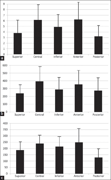 Mechanical tests of the bone cylinders from the humeral head revealed average ultimate strength values ranging from 3.21 MPa to 6.17 Mpa [Figure 4]a. The variations of CT-density [Figure 4]b expressed as average CT units (Hounsfield units) correlated (Pearson correlation) well with stiffness [Figure 4]c (r = 0.64) and strength (r = 0.84). The ultimate strength and CT-density measurements revealed that the humeral head was significantly stronger (P < 0.001) and more dense (P < 0.01) in the anterior and central regions. The weakest part of the humeral head was located posteriorly and inferiorly of the humeral head. This monocentric strength pattern was seen in all the tested specimens and therefore seemed to be independent of age. The measured strength and stiffness was not statistical different between left and right shoulders (P < 0.001) | Figure 4: (a) Normalized strength (MPa) in loading of bone cylinders from 5 different sites at the humeral head (mean ± SD). (b) CT-density (Hounsfi eld Units) from 5 different sites at the humeral head (mean ± SD). (c) Stiffness (MPa) and in loading of bone cylinders from 5 different sites at the humeral head (mean ± SD).