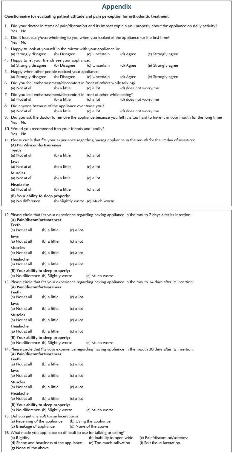 A questionnaire was used to gather information from orthodontic patients. The questionnaire developed for this study [Appendix] [Additional file 1] was based on two existing surveys. One was the "Smiles Better" survey that was used in the research of O'Brien et al. comparing the Herbst and Twin Block appliances and the other were based on a survey developed by Bowman et al. in investigating the patient experiences with the FFRD. [21],[22] Questionnaire was designed in English and verbally translated in Hindi. The same investigating dentist further explained the question in case of doubts to the patient. The questionnaire consisted of 16 questions. At the end of the data collection period, all responses were collected and subjected to statistical analysis. Descriptive statistics of all questions were calculated. In addition to descriptive statistics, Pearson Chi-square test was used to test for associations, accepting P values of less than 0.05 as statistically significant. Analyses were performed using the Statistical Package for Social Sciences Statistical Package for the Social Sciences (SPSS) Version 16.0, SPSS Inc. Chicago for Windows.