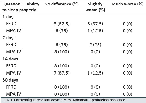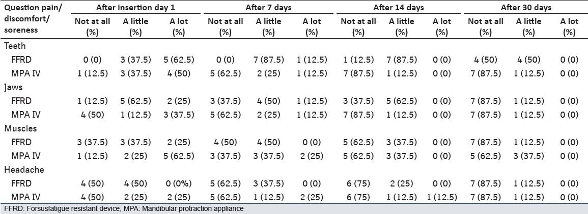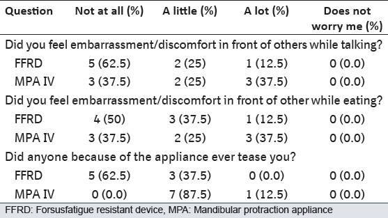 Most patients (93.75%) felt that they were given a complete description and usage instructions of the FFRD and MPA IV before wearing it. Over 68.75% of the subjects agreed that they were happy to look at themselves in the mirror with their appliances on, 31.25% subjects were glad to let their friends see their appliances while 25% were happy when people generally noticed their appliances. Responses regarding the initial effects of FFRD and MPA IV on certain functions (speech and eating) are shown in [Table 1]. They seemed to suffer the greatest initial negative impact, while talking, eating and appearance with MPA IV as compared with FFRD. MPA IV group of patients were annoyed by teasing (P < 0.022) in comparison to FFRD group of patients. When asked about their experience with side-effects when they got the FFRD or MPA IV appliance [Table 2], the majority of respondents reported being affected by (in descending order) sore teeth, jaw, muscle and headache and ability to sleep [Table 3]. Soreness on the lip/cheek from rubbing was significant with both the type of fixed functional appliances and when asked to remove the appliance 75% of subjects using MPA IV wanted to get it removed because of its rigidity and soft-tissue laceration. Subjects were asked to give advice to future FFRD or MPA IV patients. Answers were analyzed and categorized as "yes" or "no." Replies were also categorized by subject matter. Using this classification, 62.5% of the responses were yes in FFRD group and 50% replied yes in MPA IV group.