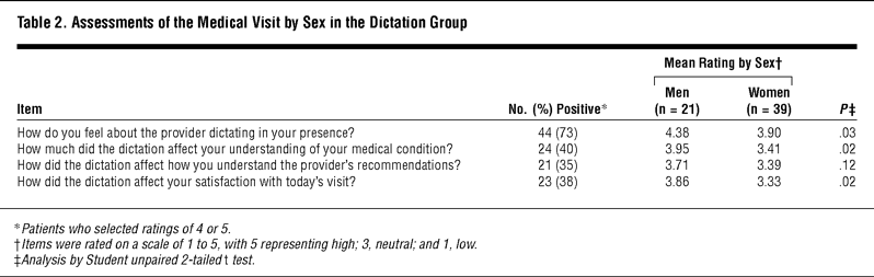 Table 2. Assessments of the Medical Visit by Sex in the Dictation Group