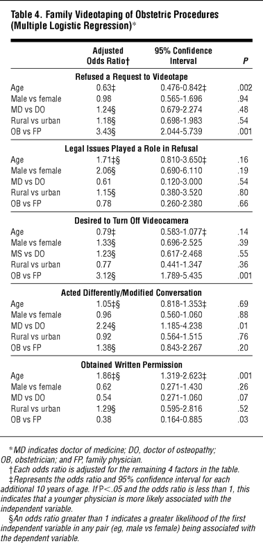 Table 4. Family Videotaping of Obstetric Procedures (Multiple Logistic Regression)*