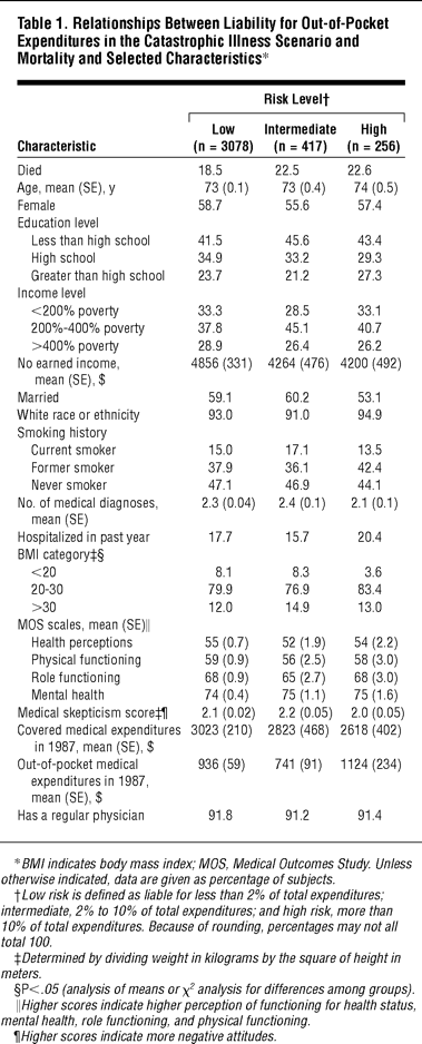 Table 1. Relationships Between Liability for Out-of-Pocket Expenditures in the Catastrophic Illness Scenario and Mortality and Selected Characteristics*