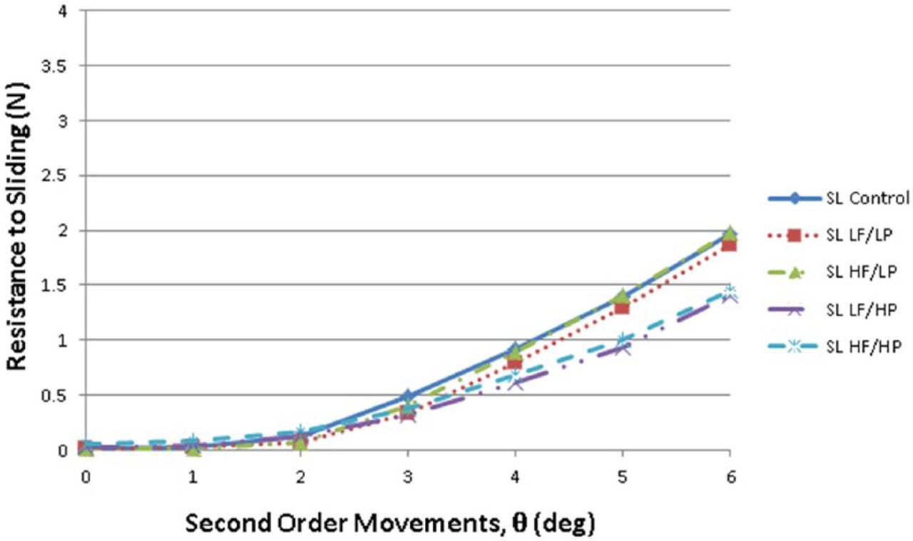 Graph of second-order movement versus resistance to sliding for passive self-ligated (SL) brackets.