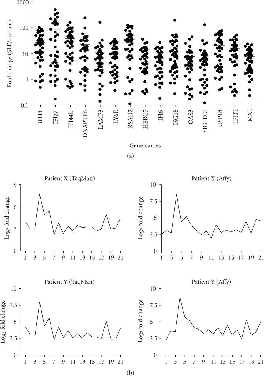 TaqMan QRT-PCR confirmed the overexpression of IFN-α/β-inducible genes in WB of SLE patients. (a) Relative fold changes of 15 IFN-α/β-inducible genes (out of the 40 assayed) in SLE patients were compared with healthy donors (Formula for all). Averages of relative mRNA levels of genes in the pooled RNA from 24 healthy donors were scaled to 1 based on TaqMan QRT-PCR assays. Horizontal bars represent average fold change. (b) TaqMan QRT-PCR validation of overexpression of the 21-gene panel of IFN-α/β-inducible genes in WB of SLE patients as determined by whole genome array. The relative overexpression of 21 IFN-α/β-inducible genes in 2 SLE patients is shown via (left) microarray and (right) TaqMan assays. Correlation coefficients (r) between TaqMan QRT-PCR and microarray were 0.986 and 0.989 for patient X and Y, respectively. IFN = interferon; QRT-PCR = quantitative real-time reverse transcriptase polymerase chain reaction; SLE = systemic lupus erythematosus.