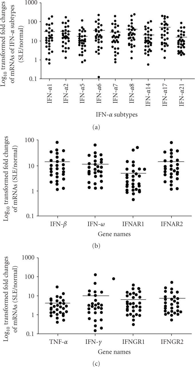 the type I IFNs and IFN-α receptors, and (c) TNF-α, IFN-ω, and IFN-ω receptors in WB of SLE patients compared with healthy