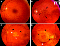 Fundus images from patients representing several AMD subtypes. A. Normal macula. B. Macula with confluent soft drusen (black arrows), a hallmark of early AMD. C. Macula of dry AMD with soft drusen (black arrows) and geographic atrophy GA (white arrows). D. Macula of choroidal neovascularization (CNV) or wet AMD with subretinal hemorrhage (black arrows).
