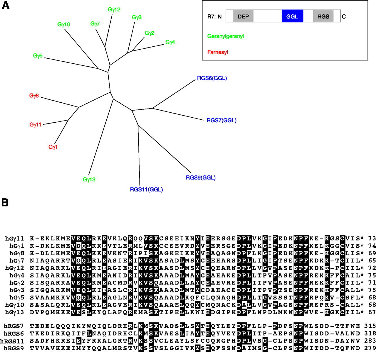 The relationship between the human Gγ subunit proteins and R7 subfamily of RGS proteins. A. An unrooted dendrogram depicts the degrees of similarity among proteins. As shown in the inset, R7 subfamily members contain a DEP domain, GGL domain, and RGS domain; only the GGL domain (blue) sequences were used for the dendrogram analysis. Gγ subunits are post-translationally modified with a geranylgeranyl (green) lipid or a farnesyl (red) lipid moiety. The unrooted dendrogram was generated using TreeView X from a multiple sequence alignment created with ClustalW using default settings. B. Multiple sequence alignment of human Gγ subunits and GGL domains of human R7 subfamily of RGS proteins. Black boxes depict identical amino acids shared by at least 60% of sequences within alignment. Sequence alignment between human Gγ subunits and GGL domains was computed by the Wisconsin GCG Pileup program using default parameters. GenBankTM gi identifier numbers for human sequences used: RGS7, 17380284; RGS6, 31742476; RGS9, 8475983; RGS11, 34452688; γ11, 4758448; γ1, 11386179; γ8, 3023844; γ7, 4826746; γ12, 40254926; γ4, 4758450; γ2, 11277005; γ3, 6912394; γ5, 4885287; γ10, 4758446; γ13, 7706567.