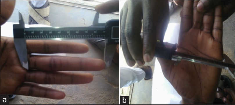 Hand dimension was measured using digital vernier caliper. Hand length was measured as the perpendicular distance from the tip of the middle finger to the wrist crease baseline. For the length of the 3rd digit (D3), a perpendicular distance from the tip of the D3 to ventral proximal crease this was used to determine the plamar length. The palmar length was calculated as hand length minus the D3 length (that is the distance from the midpoint of the distal wrist crease to the midpoint of the proximal digit crease). Palmar width was also considered as the distance between the radial side of metacarpal D2 (index finger) and ulnar side of metacarpal D5 [Figure 2]. | Figure 2: Procedure for measuring hand dimensions ([a] third digit length [b] palmar breath)