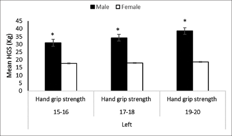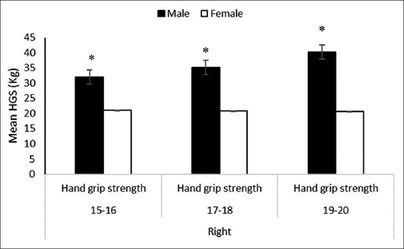 Figure 4] and [Figure 5] show a statistically significant sex differences were also observed with respect to HGS in both right [Figure 4] and left [Figure 5]. In all the three age groups, male participants tend to have higher mean value (P < 0.001) compared to the female counterparts. | Figure 4: Sexual dimorphism in the right-hand grip strength across different age categories *P < 0.001