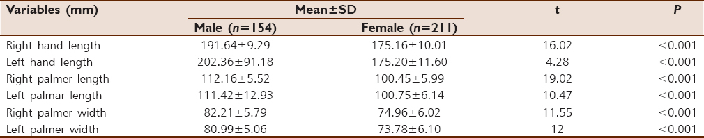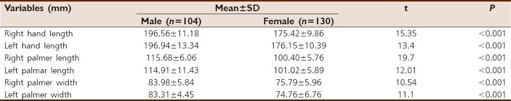 A statistically significant (P < 0.005) sexual dimorphism in hand length, palmer length, and palmer width was observed. Higher mean value (P < 0.05) was recorded among male participants in both right- and left-hand variable among three age groups, 15–16 [Table 1], 17–18 [Table 2] and 19–20 [Table 3].