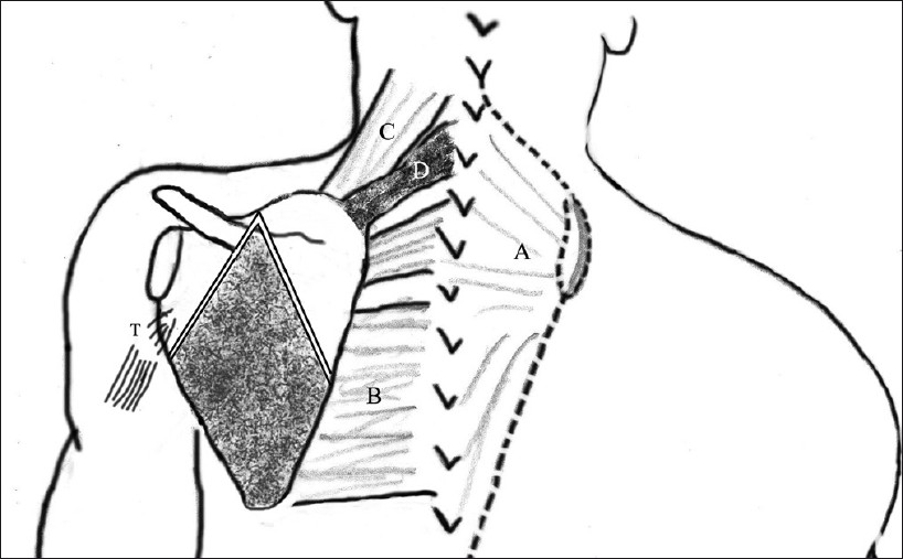 Mears described a procedure which involved (a) subperiosteal elevation of the scapular musculature, (b) extraperiosteal resection of the omovertebral bone, (c) supraspinatous fossa osteotomy, (d) release of long head of triceps and a portion of the origin of teres minor from the scapula and (e) resection of the superolateral border of the scapula to gain abduction [Figure 9]. The gain in shoulder abduction is more with this procedure as compared to the others described for Sprengel's deformity. [15],[18] Other procedures described include vertical scapular osteotomy and partial scapulaectomy. Wilkinson et al. described a vertical scapular osteotomy which consisted of a vertical osteotomy, 1 cm from the vertebral edge of the scapula so as to lower the lateral part till both the spines were at the same level. [19] Zhang et al. described a partial scapulaectomy for correction of the scapular deformity; the superior potion of the spine of scapula was osteotomized, and the omovertebral bar was excised. The adequacy of the correction was judged by comparing the superior borders of the two scapulae. [20] | Figure 9: Diagrammatic representation of Mears' procedure. The shaded region represents the area to be osteotomized (A - Reflected trapezius; B - Rhomboids; C - Levator scapulae; T - The detached triceps)