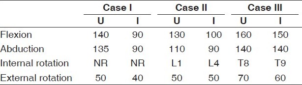 The extended anterolateral approach was again utilized to expose the axillary and radial nerves as well as the fracture site in the same manner as described above. The radial nerve was found to be adherent to the posterior spike of the humerus requiring release. There was significant osteopenia and bone loss at the site of the fracture. A 10-cm fibular allograft was inserted as an intramedullary strut into the humerus. After the fracture was reduced using fluoroscopy, the proximal and distal fracture fragments were compressed over the allograft. A proximal humerus eight-hole locking plate (Synthes) was inserted and the distal fracture fragment was fixed to the plate. When the proximal segment was reduced to the plate, a unicortical fracture occurred anteriorly. This was provisionally held with a reduction clamp. Compression screws were then placed across the fracture site as well as locking screws proximally, two of which passed through the fibular strut. Distally, screws were also passed through the allograft. A 10-hole 2.4 LCP plate was then placed over the anterior crack and transfixed. The wound was then irrigated and closed in the same manner as above. A plaster posterior splint was fabricated to maintain the arm in flexion and then was placed into a sling. Aggressive active and passive range of motion was instituted on POD #1. The patient recovered from the operation without incident. Complete union with significant callus formation was confirmed on radiographic evaluation at the 3-month follow-up. At 1-year follow-up, her range of motion for forward flexion, abduction and internal and external rotation was 100, 90, L4 and 50 degrees, respectively [Table 1]. | Table 1: Range of motion at last follow-up appointment for the uninvolved (U) and involved (I) shoulder