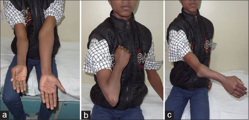 Twelve months after the index surgery, the patient sustained a traumatic fracture of the shaft the radius, which was treated with closed reduction and fixation with a Kirschner wire . The patient underwent implant removal after 3 years of surgery, in view of prominence of the implant over the elbow. The patient was last reviewed at 5 years post index surgery with plain radiography [Figure 4]b. The patient is disease-free. He has 5 cm shortening of his forearm, 10° of fixed flexion deformity at the elbow, with a further range of movement up to 130° [Figure 5]. The patient is able to do most of the activities of daily living with the operated limb. He functionally fares well with a Musculoskeletal Tumor Society Score of 27 out of 30. | Figure 5: (a) Clinical picture showing shortening in the operated forearm. (b and c) Good elbow range of movement (10-130°) at 5 years follow-up
