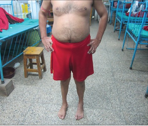 The CD4 count was 230 cells × 10 6 /l and viral load was 127,000 copies/ml. An electromyogram showed generalized fibrillation and positive sharp waves suggestive of widespread denervation pattern in all muscle groups tested in both proximal and distal limbs, both upper and lower limbs. This pattern was classical of motor neuron disease (MND). Nerve conduction study showed diminished compound motor action potential with normal conduction velocity in both the median, ulnar, and peroneal nerves. Sensory motor action potential, F-wave, and H-reflex were normal. There was no evidence of multifocal motor neuropathy with conduction block. Tests were performed in order to exclude secondary causes of a lower motor neuron type of muscle weakness in this patient (other than HIV) whereby normal results were obtained for renal function tests, serum electrolytes including sodium, potassium, calcium, phosphate, liver function tests (except raised globulin level), fasting and postprandial blood glucose, creatine phosphokinase, thyroid function tests, serum protein electrophoresis, serum B12, and red blood cell folate. Peripheral blood picture suggested normocytic, normochromic anemia.