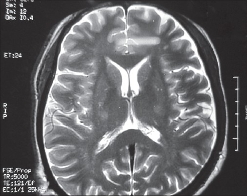 Cerebrospinal fluid (CSF) study was normal except for a marginal protein rise (51 mg/dl; normal 20-40 mg/dl). Syphilis serology by treponema pallidum hemagglutination assay, rheumatoid factor, antinuclear factor (ANF), antinuclear antibody, and ANF profile (including antineuronal nuclear antibody type 1), antiganglioside antibodies, acetylcholine receptor antibodies and human T-cell lymphocytotropic virus type 1 (HTLV-1) antibodies were all negative. Lyme serology was not done as Lyme disease is not common in India and so facilities for testing were not available. Serum lead level was normal. MRI of the corticomedullary junction and cervical spine, with and without contrast, ruled out any compressive myeloradiculopathy. MRI brain showed hyperintensity in bilateral corticospinal tract in the region of internal capsule, which was classical of ALS [Figure 3]. A final diagnosis of ALS secondary to HIV was made. He was administered new HAART regimen comprising of zidovudine, lamivudine, and ritonavir (saquinavir was discontinued due to its high dose requirement, which had led to poor adherence previously). Strict adherence to treatment was ensured after counseling sessions of the patient and education of his family members regarding the importance of regular intake of drugs in this patient. Alongside, he was started on riluzole 50 mg twice a day. Follow-up after 3 months revealed marginal improvement in limb muscle weakness, but no improvement in bulbar function. | Figure 3: Hyperintensities in both corticospinal tracts in the region of internal capsule