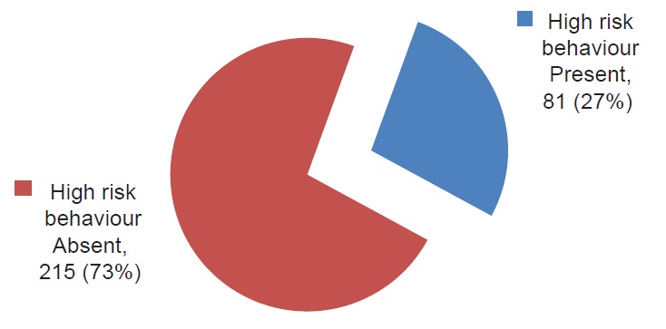 Among 199 married workers only 33.16% workers were living with their spouses. Among 296 construction workers 81 (27.37%) workers had given history of sexual intercourse with commercial sex workers (CSWs) for one or more than one time [Figure 2].