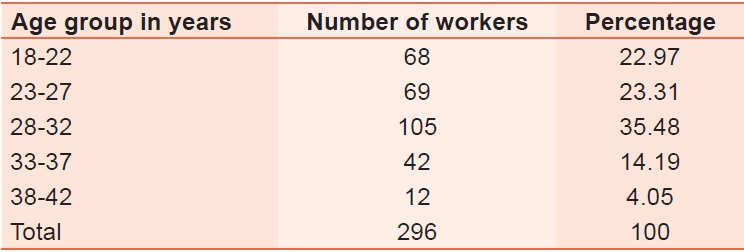 Total 296 construction workers were enrolled in the study. The mean age of 296 workers was 28.67 years with standard deviation (SD) of ±5.685. Most of the workers, that is, 35.48% belong to 28-32 years of age group [Table 1].