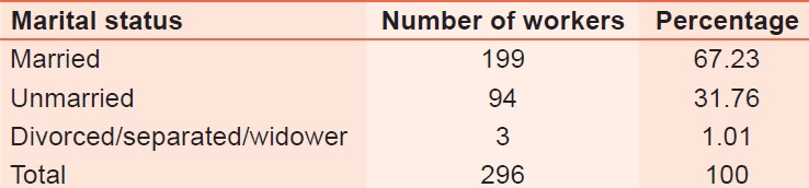 The average years of duration of stay in Mumbai city of those workers who were from other states was 4.36 years with ±2.10 SD It was observed that 67.23% workers were Hindu by religion, followed by Muslim 16.89%, Buddhist 12.5% and 3.38% of other religion. 67.23% (199) workers were married [Table 2]. | Table 2: Distribution of construction workers according to their marital status
