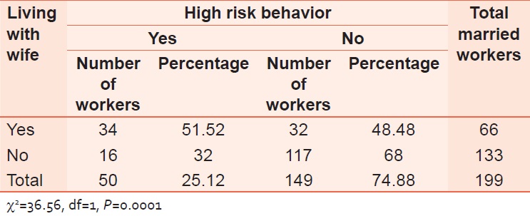 It was evident that 32.98% (31) unmarried and 25.12% (50) married workers had visited CSW's. The relation between marital status and high-risk behavior was not found statistically significant after applying Chi-square test (P = 0.209). It was observed that among the 66 married male who were living with their wives, 34 (51.52%) had high risk behavior and among 133 married male who were not living with their wives 16 (32%) had high risk behavior. It was found statistically significant with P = 0.0001 with Chi-square test and hence high-risk behavior was more in those workers who were living with their wives [Table 4]. | Table 4: Relationship between high risk behavior and status of living with wife among married study subjects (n=199)