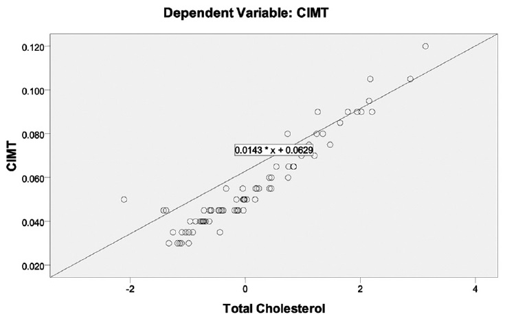 | Figure 2: Scatter plot showing significant direct relationship of coefficients of CIMT with total cholesterol