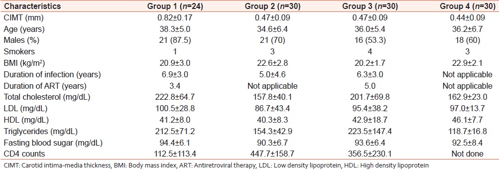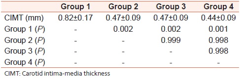 There were 24 patients in Group 1 (HIV-infected patients on PI-based cART), 30 patients in Group 2 (HIV-infected patients not on any ART), 30 patients in Group 3 (HIV-infected patients on non-PI based cART), and 30 patients in the age-matched healthy controls. The CIMT was significantly increased in Group 1 (PI group) with P < 0.01 as compared to other groups using ANOVA. The P values for pairwise comparison using Tuckey's test for CIMT are given in [Table 1]. Group 1 (PI group) was significantly different from others; however there was no difference when Group 2 (HIV patients not on cART) and Group 3 (HIV patients on non-PI based cART) were compared to Group 4 (healthy controls) or to each other. | Table 1: P values of comparison of individual groups with each other using ANOVA