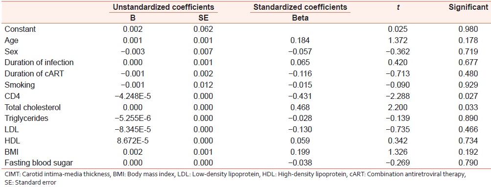 The other significant finding from our study was that higher CIMT was associated with lower CD4 count. This finding may suggest a role of immunological changes in the pathogenesis of accelerated atherosclerosis in patients surviving with advanced HIV infection. Our study design does not permit that question to be answered, and it may be the topic for future research. It is also possible that the significant association of lower CD4 count in the subset of HIV patients on PI-based therapy and higher CIMT in our study may be biased. PI-based therapy is reserved for those who have failed first-line therapy. A patient with failed first-line therapy will invariably have falling or low CD4 counts and will be a candidate for PI-based therapy, and this may have contributed to the bias in that group. However, there are studies, which have shown that advanced HIV infection due to immune system dysregulation may itself be a risk factor for atherosclerosis supporting the finding in our study. [19],[20] A larger study designed to address that question is needed.