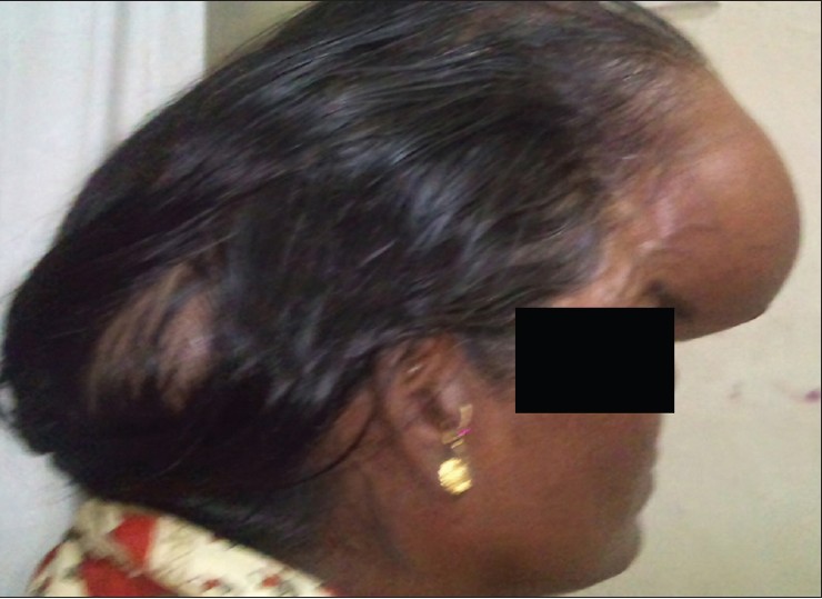 Follicular thyroid carcinoma is a subtype of thyroid cancer, which is slow growing and is associated with a good prognosis. However, in the presence of distant metastasis the prognosis is often poor. [5] Lung and bone are the two most common sites of metastases. [6] Bone metastases from follicular thyroid carcinoma tend to be multiple and more often to the ribs, vertebrae, and sternum. [7] Skull is a rare site for metastases; and if this occurs, are most commonly located in the occipital region presenting as a soft, painless lump. Presenting features of skull metastasis usually include a palpable scalp tumor, though unusual presentations with exophthalmos, disturbance of consciousness, hemiparesis, and headache have also been reported. These lesions are osteolytic on skull X-ray and CT scan and highly vascular on angiographic assessment. [1],[2] The largest case series of skull metastases from all types of thyroid cancers consists of 12 cases reported by Negamine et al. [1] In this series, mean time from the diagnosis of thyroid tumor until discovery of skull metastasis was 23.3 years. Prognosis in case of metastasis is generally poor and the 10-year survival with bone metastases from differentiated thyroid cancers is reported to be 27%. [6] However the reported mean survival in patients who present with skull metastases in the case series by Negamine et al. is only 4.5 years, suggesting that these subset of patients tend to do even worse. [1] Radioactive iodine therapy is essential to treat such metastatic disease. Lung metastases usually respond to radioactive iodine treatment. However bone metastases uncommonly respond to radioactive iodine therapy and are associated with poor prognosis [6] because of the low remission rate in radioactive iodine therapy and poor prognosis in patients with bone metastases, the surgical approach should be considered as one of the treatments of choice for bone metastasis, if possible. Curative resection of solitary bone metastasis is associated with improved survival, especially in younger patients. [7],[8]