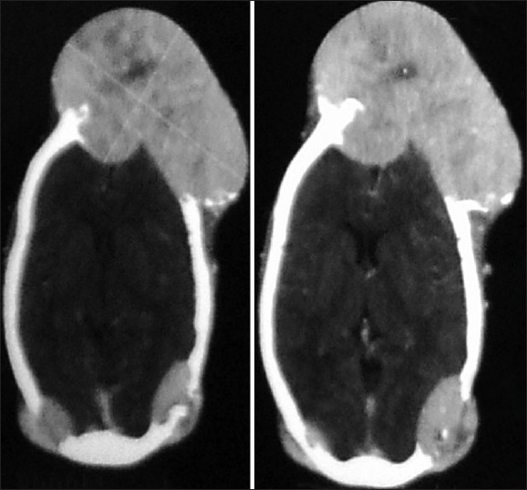 | Figure 2: Metastasis from follicular thyroid carcinoma in right parietooccipital region of skull