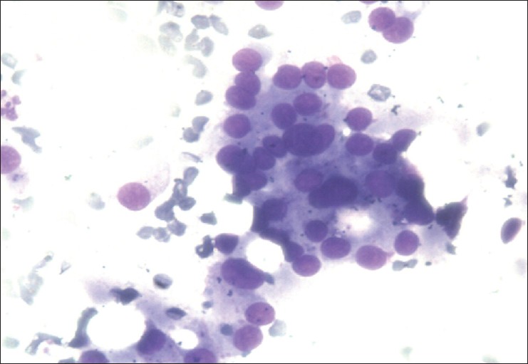 | Figure 4: FNAC from skull swelling showing presence of thyroid cells confirming the metastatic nature of swellings from follicular carcinoma thyroid