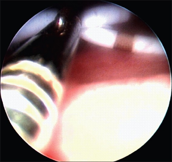 6 patients were subjected to bilateral DJ stent removal from February 2011 to November 2011 after written and informed consent. Indications for bilateral DJ stenting were following bilateral URS in 4 patients and bilateral extracorporeal shock wave lithotripsy for pelvic calculi in 2 patients. All patients were positioned in lithotomy. Rigid cystoscopy was done using 19 Fr Sheath and 30 degree lens (KARL STORZ, Germany) in all patients. 5 Fr stent removal forceps is passed through the channel of the cystoscope bridge into the bladder. The bladder is kept partially filled, otherwise the two crossing stents will diverge apart. The two stents appear to be crossing like a "X" when seen cystoscopically [Figure 1]. With the help of stent removal forceps, both the DJ stents are grasped at the point of crossing i.e. at the mid-point of "X" and retrieved simultaneously along with the cystoscope [Figure 2]. | Figure 2: Cystoscopic appearance of 5 Fr stent removal forceps grasping both the DJ stent at the mid point of "X" (or at point of crossing) and being retrieved
