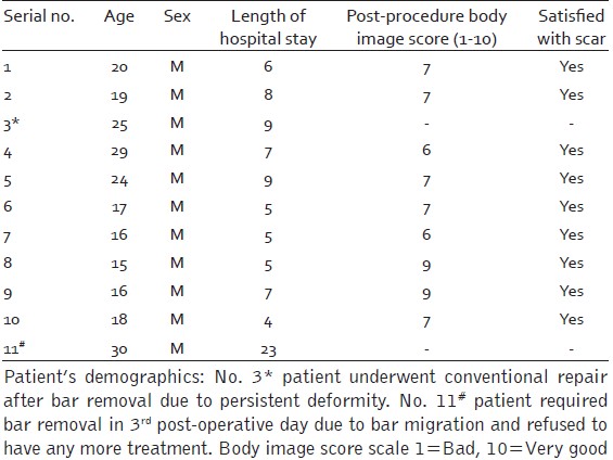 Patients were followed up at 6 weeks following surgery and at 3-monthly intervals in the 1 st year and 6-monthly intervals in the 2 nd year. Excellent surgical outcome was observed in nine patients at the 6-week follow-up appointment. One patient had persistent chest wall deformity and underwent Ravitch repair after bar removal. In the follow-up clinic, the remaining nine patients were satisfied with the scar and pain control. Seven patients scored more than 7 on satisfaction with body image and two patients scored less than 7.