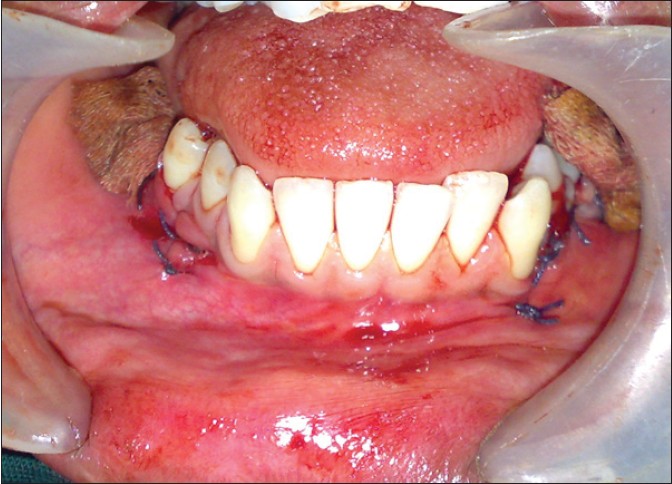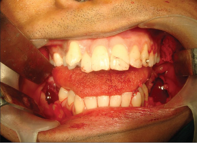 Under general anesthesia the cystic lesions in all four quadrants were enucleated along with impacted third molars and supernumerary teeth. Also in both quadrants of mandible extraction of the first and second molars were carried out as they were mobile. The resultant cavities [Figure 10] in the mandible after enucleation were packed with bismuth, iodoform, paraffin paste, and healing was by secondary intention [Figure 11]. Follow-up dressing was done after 24 hours postoperatively for the first 2 weeks and then follow-up of intraoral wound irrigation and dressing was carried out once a week for next 2 months for healing of the bony defects in mandible intraorally. Postoperative follow-up orthopantomographs (OPGs) were taken at regular monthly intervals. Six months postoperatively the dimensions of the cystic cavity were reduced both clinically and radiographically [Figure 12] and [Figure 13]. The patient is still under routine follow-up and will be closely monitored for long-term outcome. | Figure 10: Intraoperative clinical photograph showing resultant bony cavities after enucleation of dentigerous cysts in mandible