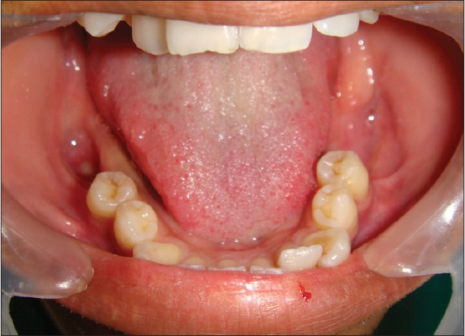 A 24-year-old male reported to the Department of Oral and Maxillofacial surgery in Mayya Multispecialty Hospital, Bangalore, India, complaining of asymptomatic facial swelling of 1 year. An intraoral clinical examination revealed a non-tender bilaterally palpable swelling. The swelling extended from the first premolar to third molar region on the right, and from the first premolar region to the retromolar trigone on the left [Figure 1] and [Figure 2]. The swelling obliterated the buccal vestibule bilaterally and there was associated mobility of the first and second molars on both sides of mandible. The overlying mucosa appeared normal in color, non-tender, hard in consistency, and smooth on palpation. The third molars were unerupted in all the four quadrants. There was no history of paresthesia in lower lip region. All the sensations were found to be normal in lower lip area on clinical evaluation. Vitality was found to be present in first and second molars, premolars, and anterior teeth after thermal stimulation test using hot gutta percha application on teeth. | Figure 1: Preoperative clinical photographs showing intraoral swellings in the retromolar area on right side
