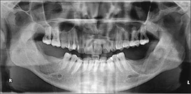 Dentigerous cysts are one of the most common developmental odontogenic cysts. [7] Dentigerous cysts are the second-most common true cysts of the jaws following radicular cysts. [8] Majority of the dentigerous cysts are associated with the permanent teeth during the second decade of life. [9] Most dentigerous cysts are solitary. Bilateral and multiple cysts are usually found in association with a number of syndromes including cleidocranial dysplasia and Maroteaux-Lamy syndrome. [10] Occurence in the mandibular third molar region is more common compared to maxillary third molar region. [11] The dentigerous cyst is usually associated with impacted third molars and canines. [12],[13] The presented case is unique as it shows dentigerous cysts involving all the four quadrants and not associated with any syndrome symptoms like underdeveloped or absent clavicle and frontal bossing or open fontanales as seen in cliedocranial dysplasia. A review of literature shows no report of any case with dentigerous cyst involving all four quadrants. [14] This appears to be the first reported case in literature.