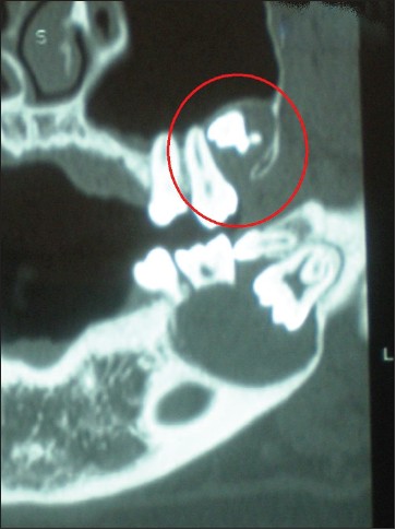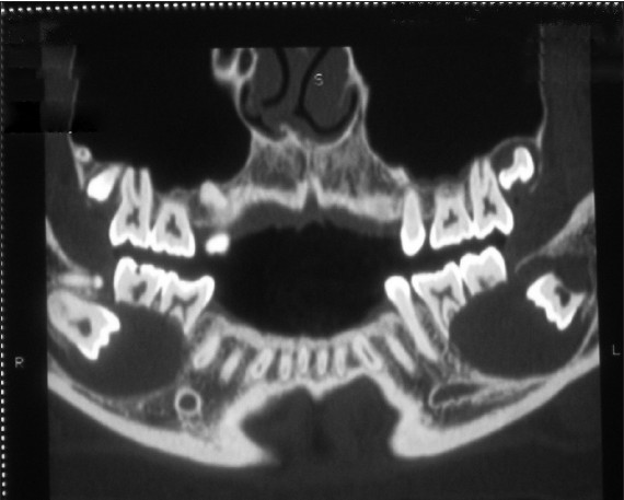 | Figure 4: CT image shows maxillary radiolucent lesion surrounding the right impacted third molar