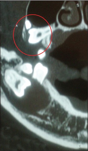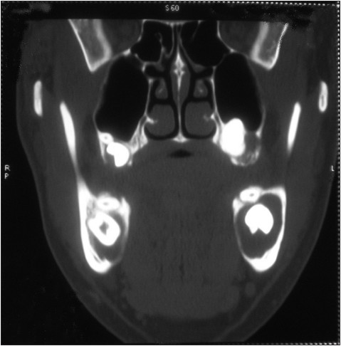 | Figure 5: CT image shows maxillary radiolucent lesion surrounding the left impacted third molar
