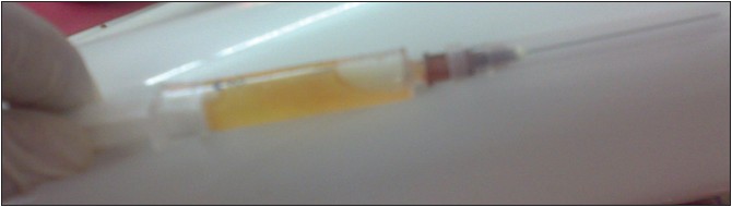 A radiographic investigation by CT scan revealed a unilocular well-defined corticated hypodense lesion involving impacted mandibular third molars bilaterally [Figure 3]. The dimensions of the hypodensities were 31 and 42 mm anteroposteriorly on the right and left, respectively. There were also associated supernumerary teeth on both sides. The supernumerary teeth were small in size than third molars with single conical root and were placed coronally in close relation to third molars on both sides. The hypodensities were associated with radicular resorption of the first and second molars. Radiographs also revealed the inferior displacement of the mandibular canal. Incidentally another bilateral hypodense lesion associated with the crowns of maxillary third molars was observed. CT-Scan revealed a well-defined and corticated margin was observed surrounding the unilocular hypodensity. In maxilla, CT-scan revealed the dimensions of hypodensities around the crowns of third molars to be 15 and 18 mm in diameter on the right and left side, respectively [Figure 4] and [Figure 5]. There was no root resorption of adjacent teeth observed in maxilla. In all four quadrants the hypodense lesions were attached to the cementoenamel junction of the third molars at an acute angle which is one of the classical radiographic finding in cases of dentigerous cyst. Coronal sections and three-dimensional CT revealed bilateral lingual and buccal cortical perforations in mandible [Figure 6]. On aspiration a straw-colored fluid was obtained from each of these cystic lesions which is diagnostic of a dentigerous cyst [Figure 7]. | Figure 3: CT image showing bilateral expansile radiolucent lesion surrounding both the mandibular and maxillary third molar regions along with supernumerary teeth