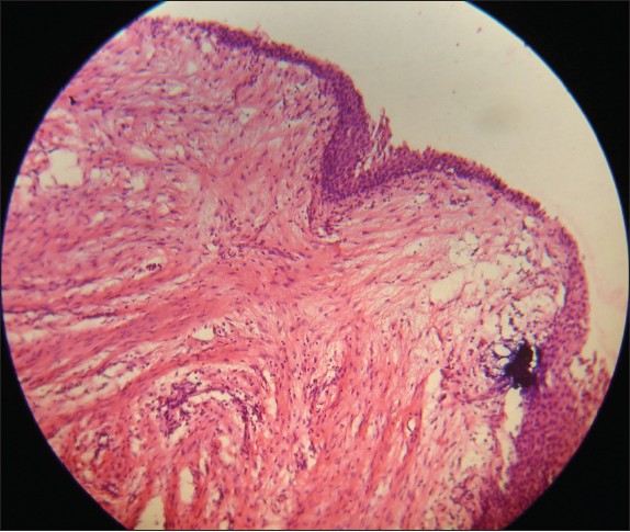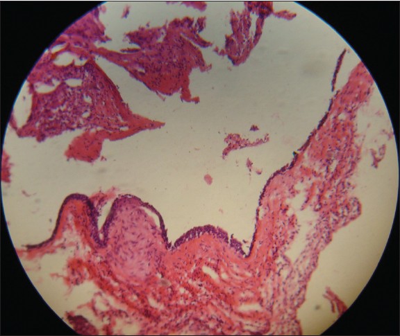 After clinical and radiological examination a provisional diagnosis of dentigerous cyst was made. Multiple incisional biopsies were taken and histopathological examination revealed a cystic lumen lined by two to three-layer thick non-keratinized stratified squamous epithelium that resembled reduced enamel epithelium. The connective tissue wall was composed of a fibrous capsule which confirmed the diagnosis of dentigerous cyst [Figure 8] and [Figure 9]. | Figure 8: Histopathological section showing the cystic epithelial lining typically of dentigerous cyst