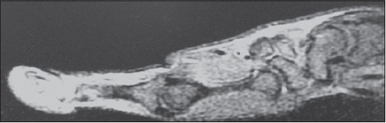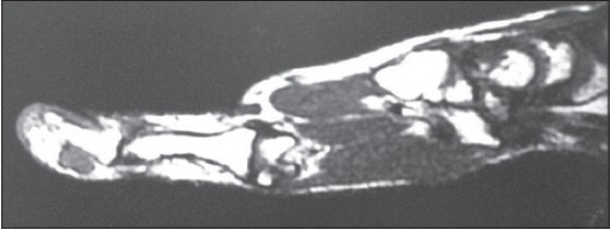 Plain X-ray of hand was normal [Figure 1]. Magnetic resonance imaging (MRI) was suggestive of swelling arising from insertion of flexure pollicis longus tendon, dark on T1 and bright MRI appearance on T2-weighted image [Figure 2] and [Figure 3]. They gave differential diagnosis of synovial swelling and glomus tumour. | Figure 2: T2 weighted Magnetic resonance imaging showing swelling arising from tendon insertion