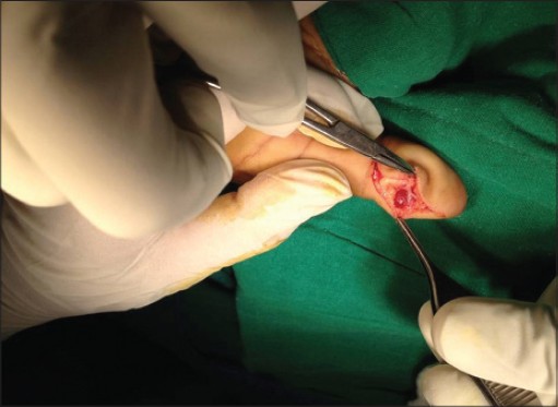 An alternate approach is through a lateral incision through an L-shaped incision parallel to and 4-6 mm toward the volar side of the lateral nail fold. [12] The incision allows exposure to the dorsal distal phalanx without violating the nail matrix, so reducing the risk of postoperative nail deformity. The nail bed is carefully dissected from the bone until the tumor is reached and extirpated. Extirpation is usually curative, although the pain may take several weeks to disappear. However, the lateral approach affords a more narrow view of the tumor bed, with a higher chance of incomplete excision, compared with the transungual approach. In our case, the lateral approach was enough for complete excision because the lesion was located in volar pulp.