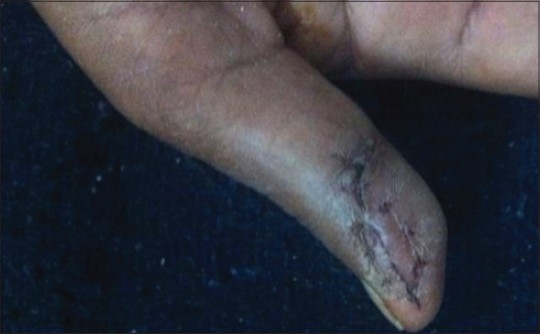 A 45-year-old female patient presented with a 10-year history of progressively intense pain, cold sensitivity, and severe tenderness to palpation of the lateral side of the volar aspect of her right thumb. She had diffuse swelling of right thumb present. No history of any previous trauma. We performed Love's pin test, Hildreth's test, and a cold sensitivity test. The point tenderness was localized on her right thumb, which was determined by pressing the head of a pin against the tender lesion. Tenderness disappeared after tourniquet at base of thumb for 20 min. The pain increased when her digit was exposed to cold.