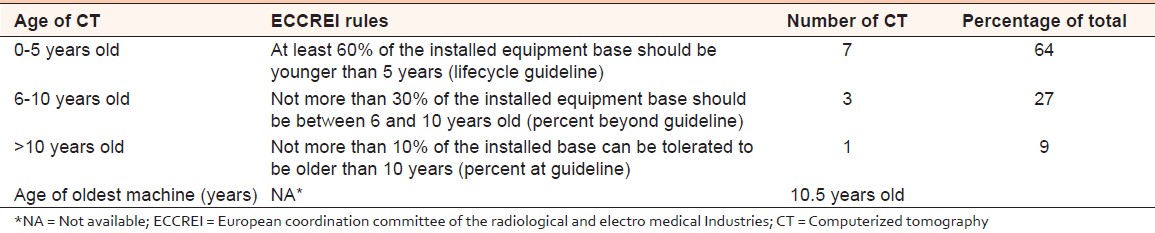 CT scanners age in the region compared against guidelines published by the rules of European Coordination Committee of the Radiological and Electro medical Industries (ECCREI) for the guidelines of CT scanners age published by the ECCREI According to the rules from ECCREI. [10]