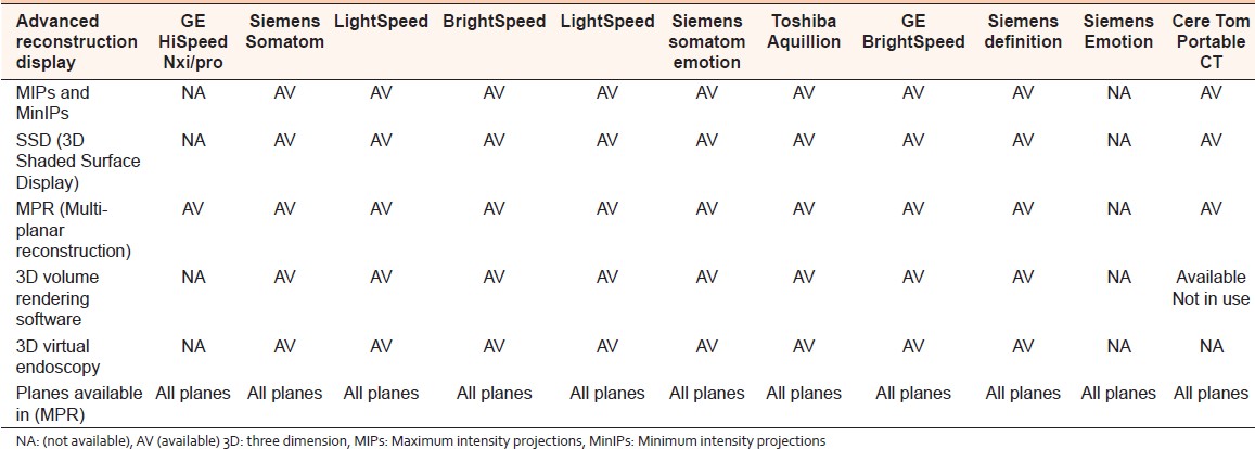 [Table 9] declares that all CT units of the region have an advanced reconstruction and 3D display with exception to GE HiSpeed, which has only multi-planar reconstruction and Siemens emotion 1 slice in which there is no advanced reconstruction and 3D display as its single slice. | Table 9 Technical Specifi cations Comparison (Advanced Reconstruction Display)