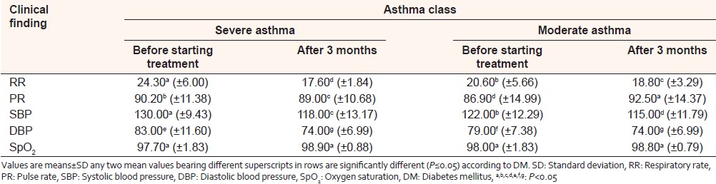 Totally, 30 asthmatic patients were included (14 females and 16 males), aged 16-50 years with a mean age of 43.91 ± 5.8. There was statistically significant decrease in respiratory rate, systolic BP and diastolic BP, PR increase in moderate asthma patients. SPO 2 increased but not statistical significant [Table 1]. Wheezing symptom was significantly reduced by the end of the 3 rd month in both asthma categories [Figure 1]. | Figure 1: Finding of auscultation in severe and moderate asthma patients done before and after three months of Bee's honey and Nigella sativa usage